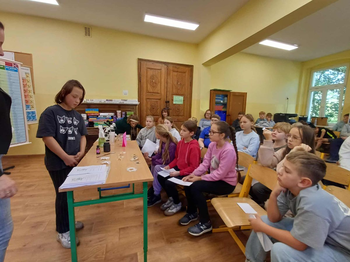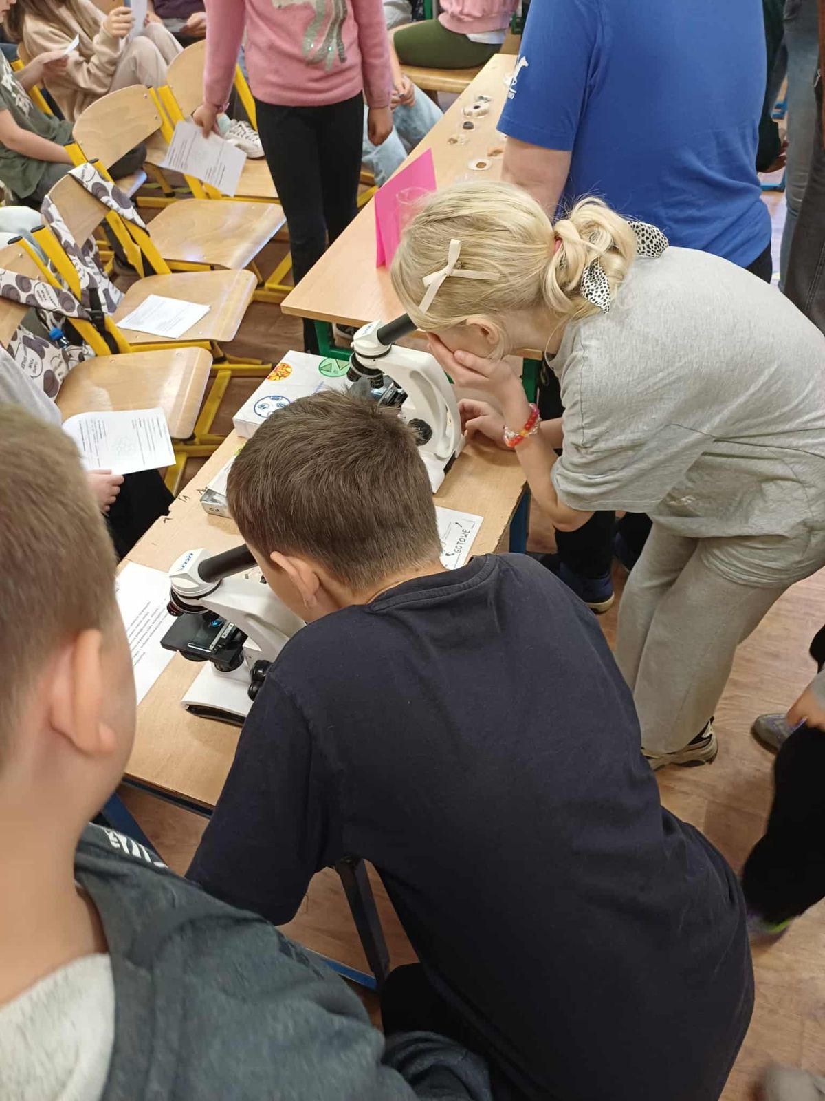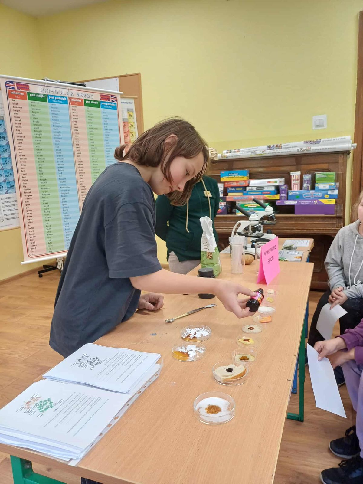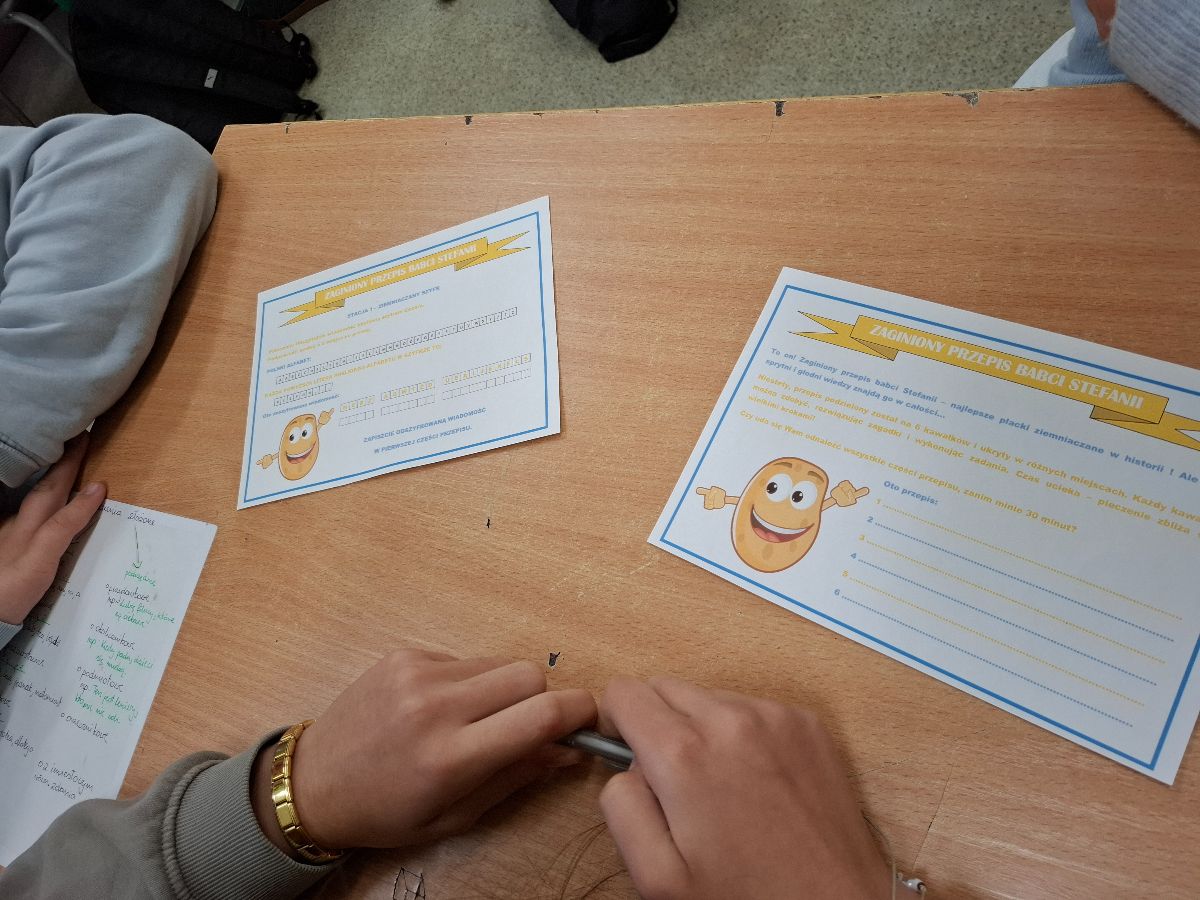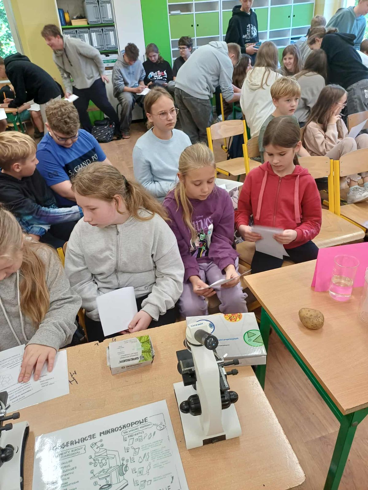 Klasy 4-8 miały okazję poznać historię ziemniaka oraz informacje związane z jego budową, cyklem wzrostu, zastosowaniem oraz aspektami geograficznymi jego uprawy. Obejrzeliśmy prezentację multimedialną i film, które dostarczyły nam sporej dawki wiedzy. Następnie wzięliśmy udział w warsztatach biologiczno-chemiczno-geograficznych, podczas których pracowaliśmy z mapą, wykrywaliśmy skrobię w różnych produktach oraz mogliśmy przygotować ziemniaczany preparat i obejrzeć go pod mikroskopem. Na zakończenie bawiliśmy się w uproszczonej formie escape roomu. Celem tej części dnia było zdobycie przepisu na placki ziemniaczane, czego dokonaliśmy poprzez rozwiązanie 5 zagadek logicznych, matematycznych i ortograficznych.