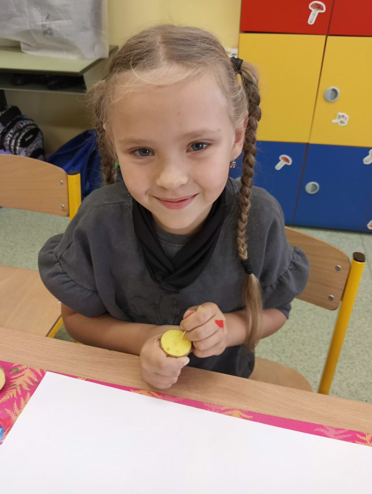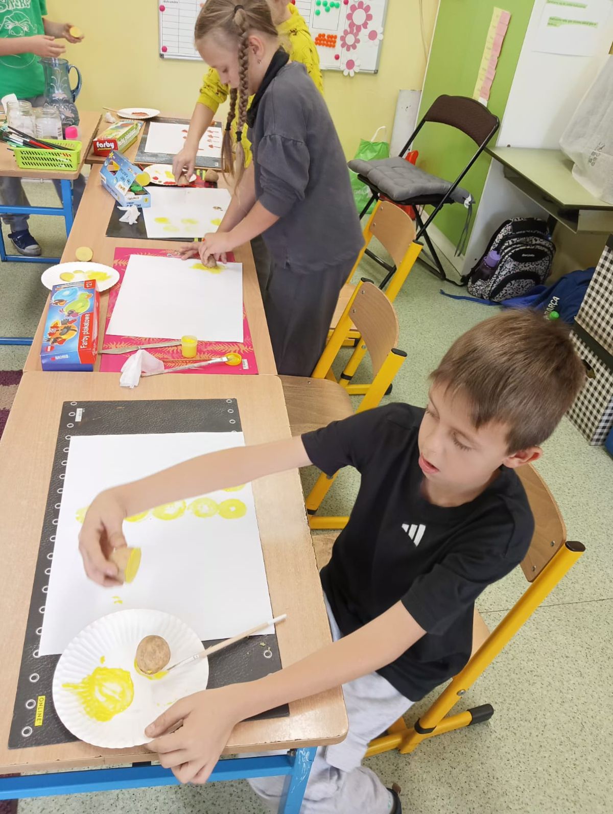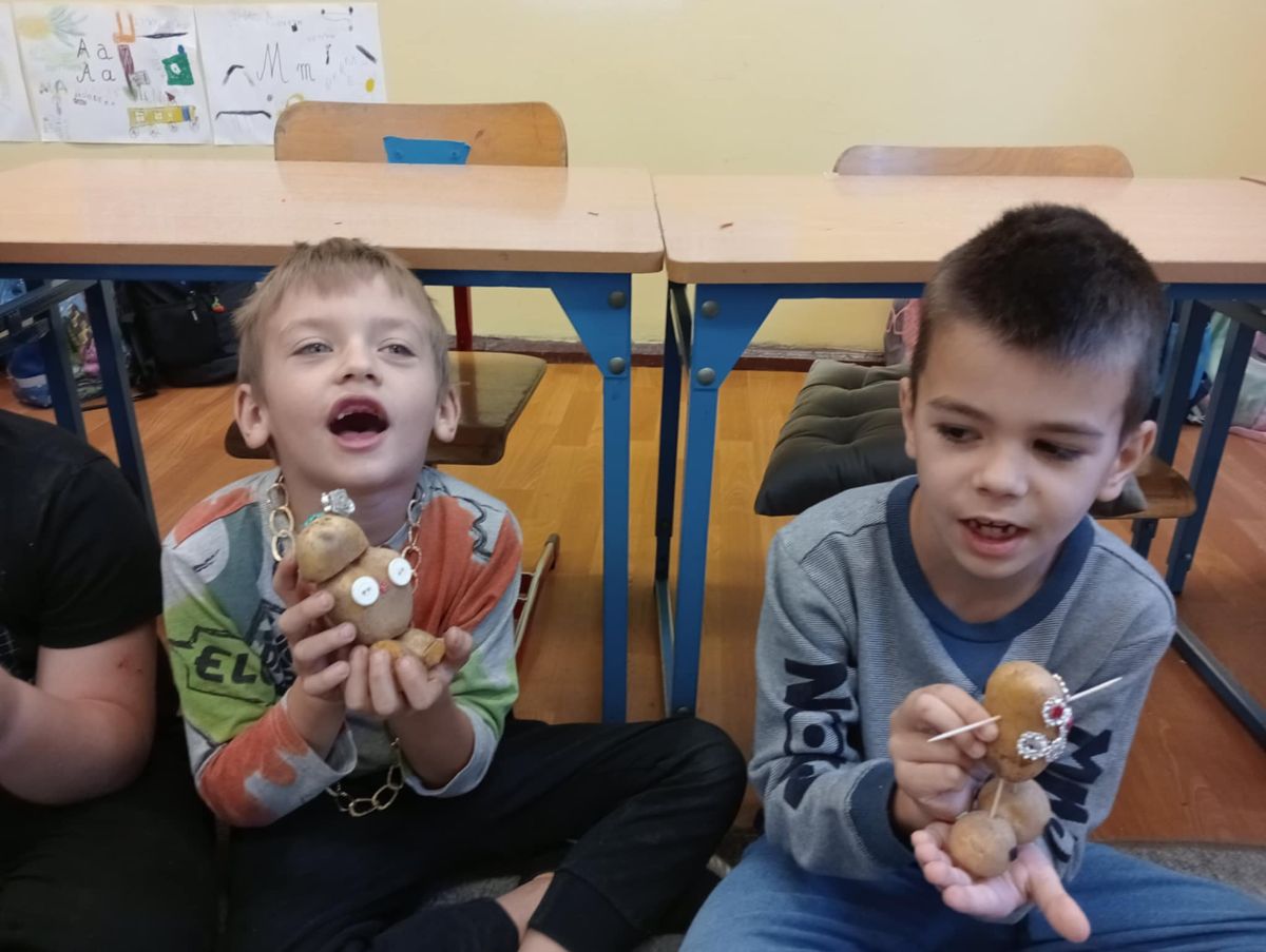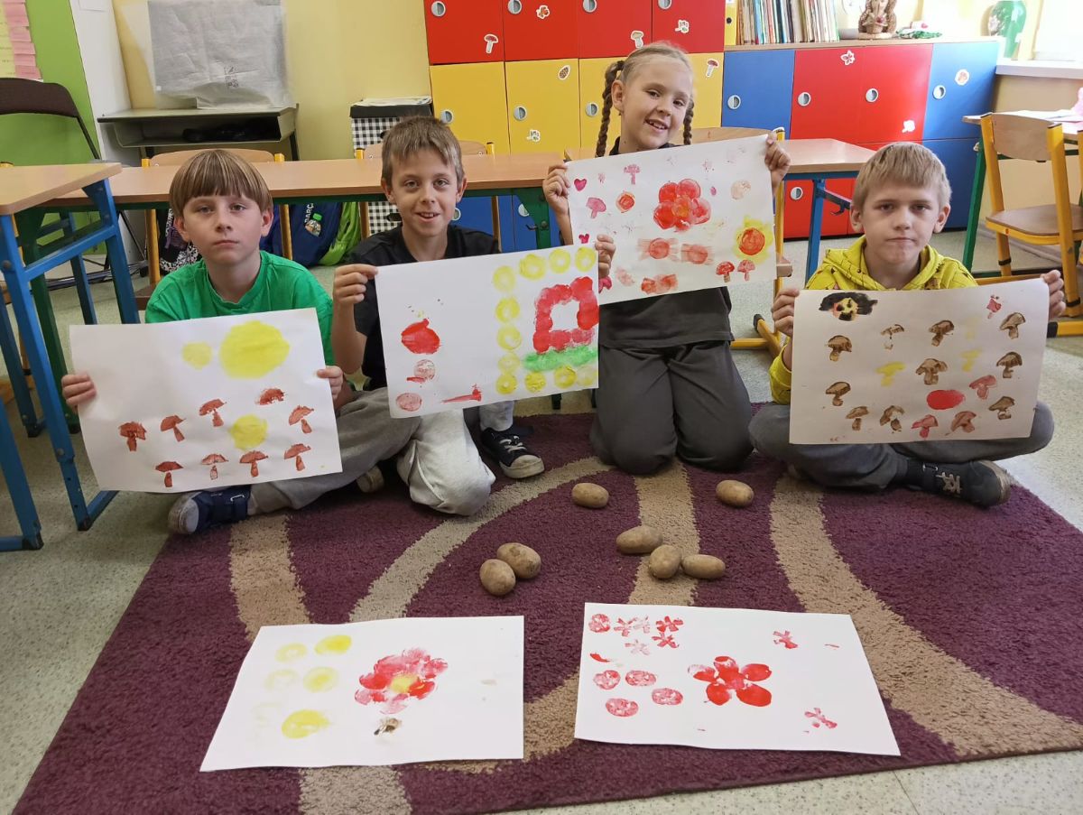 Klasy 0-3 rozpoczęły podróż przez ziemniaczany świat od wysłuchania bajki o ziemniaku. Po zapoznaniu się z jej treścią wychowawczynie przeprowadziły ze swoimi uczniami dyskusje na temat opowiedzianej historii. Były one pełne mądrych wniosków, pokazały także, że przemycona w opowieści wiedza pozostała w głowach. Kolejnym etapem były prace plastyczne (kolorowanki, tworzenie ziemniaczanych stworów, pieczątek z ziemniaka) oraz ziemniaczane karty pracy.