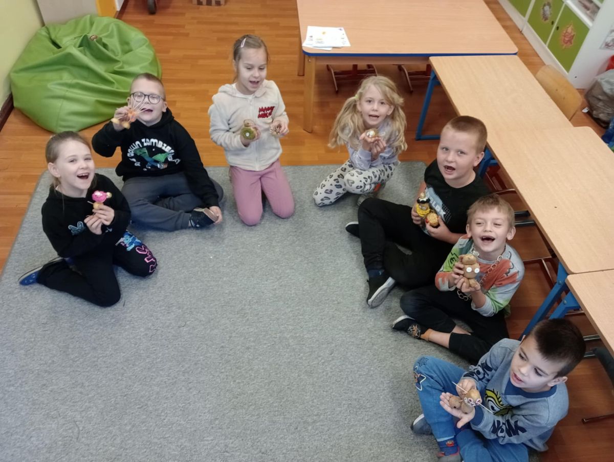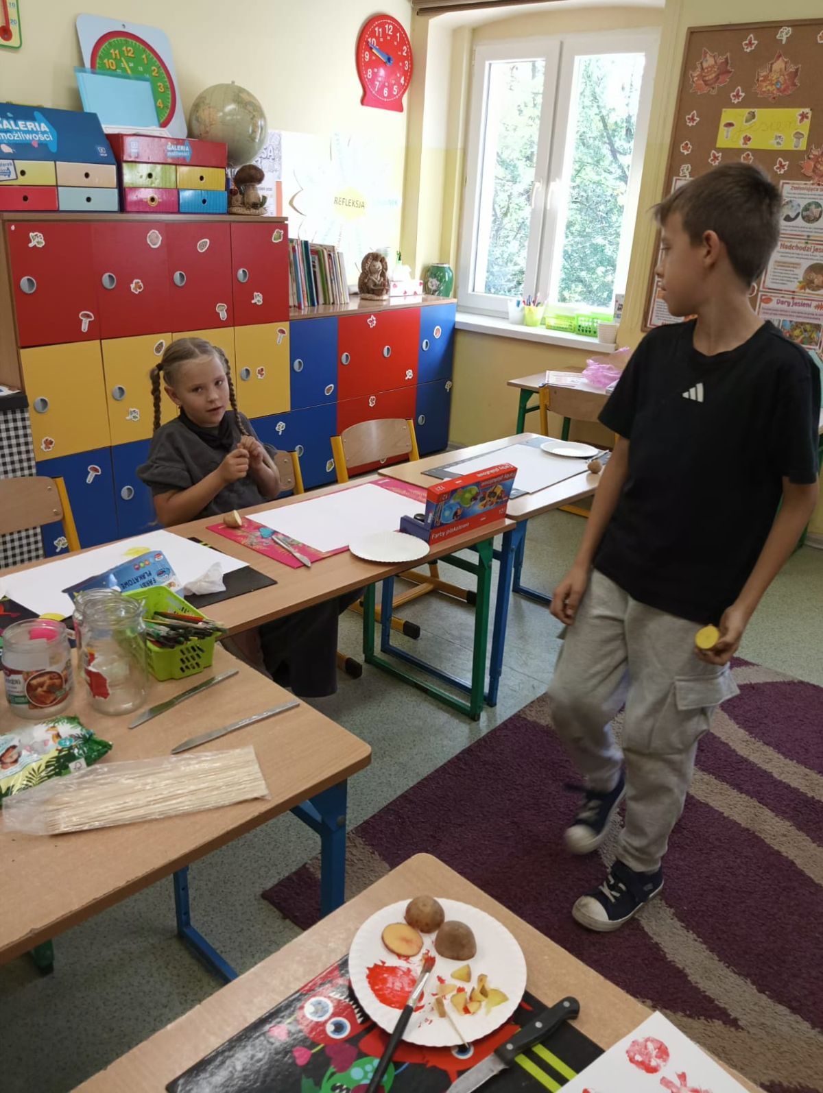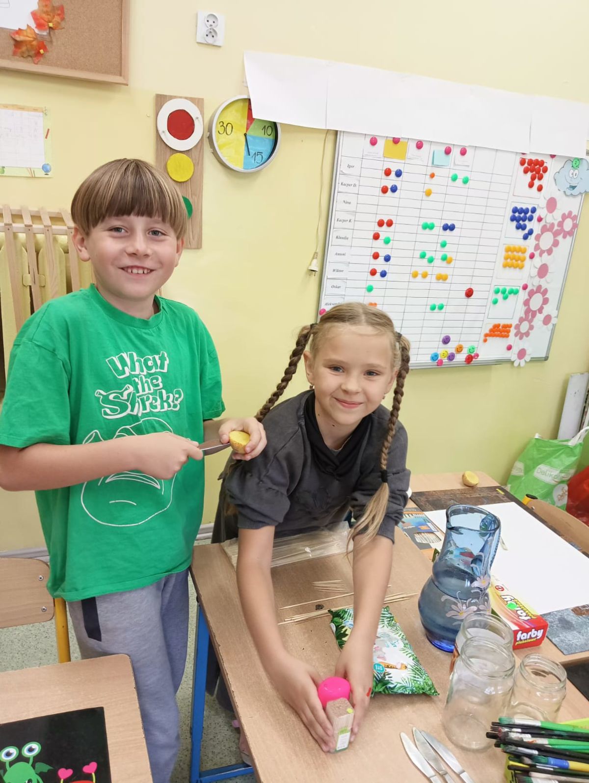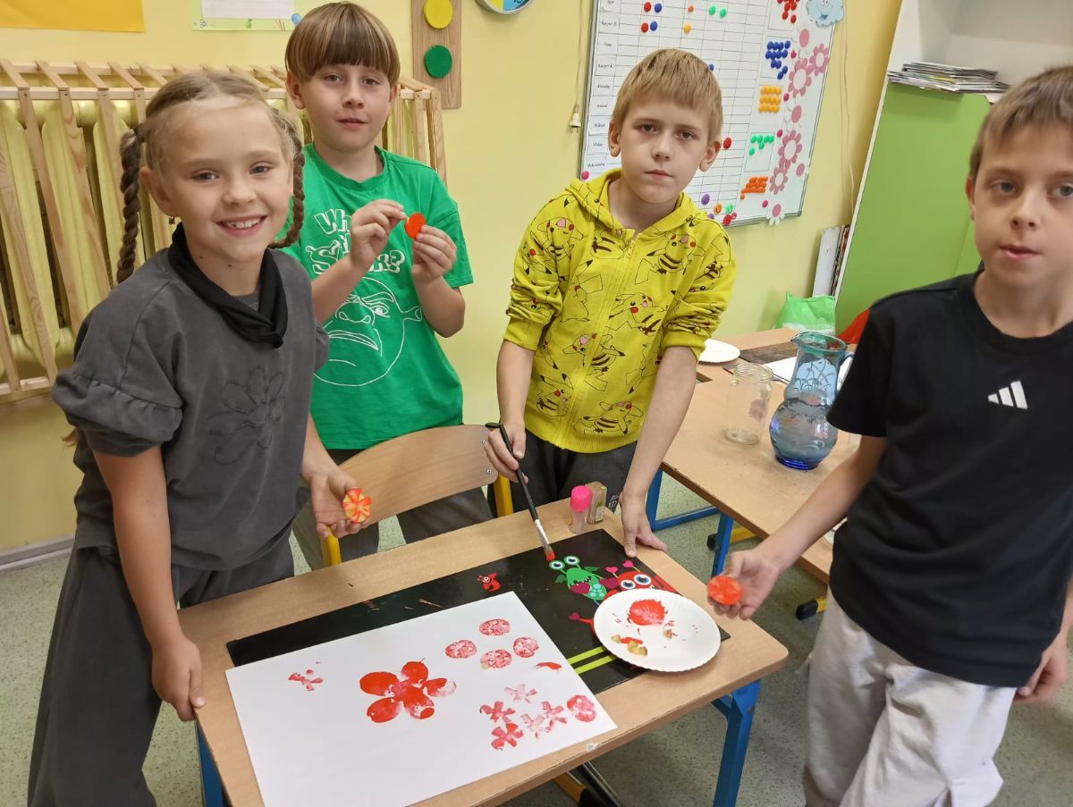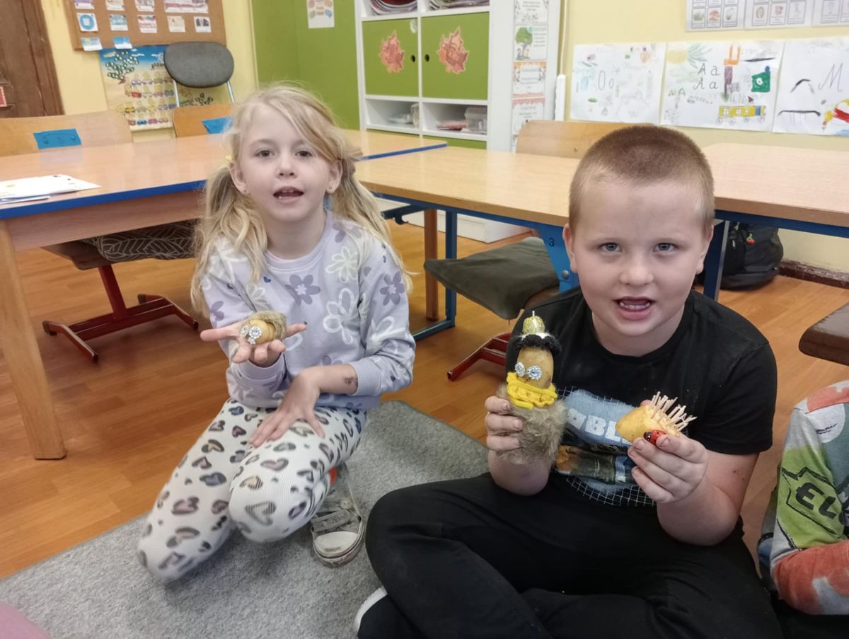 Klasy 0-3 rozpoczęły podróż przez ziemniaczany świat od wysłuchania bajki o ziemniaku. Po zapoznaniu się z jej treścią wychowawczynie przeprowadziły ze swoimi uczniami dyskusje na temat opowiedzianej historii. Były one pełne mądrych wniosków, pokazały także, że przemycona w opowieści wiedza pozostała w głowach. Kolejnym etapem były prace plastyczne (kolorowanki, tworzenie ziemniaczanych stworów, pieczątek z ziemniaka) oraz ziemniaczane karty pracy.