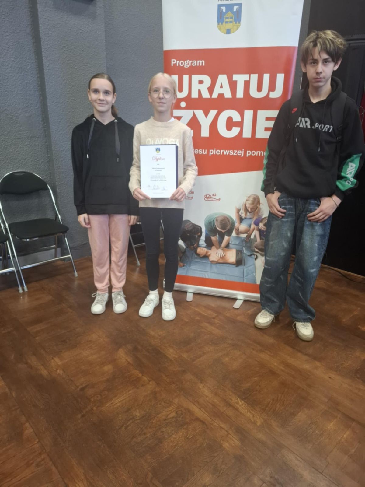 Uczniowie naszej szkoły: Agata Białecka, Zosia Bereźnicka i Szymon Kowalski, promując ratowanie ludzkiego życia i zdrowia, po raz pierwszy wzięli udział w Powiatowym Konkursie z Zakresu Udzielania Pierwszej Pomocy "Uratuj życie". Do udziału w konkursie uczniów przygotowała Pani Agnieszka Budziak. Gratulujemy!